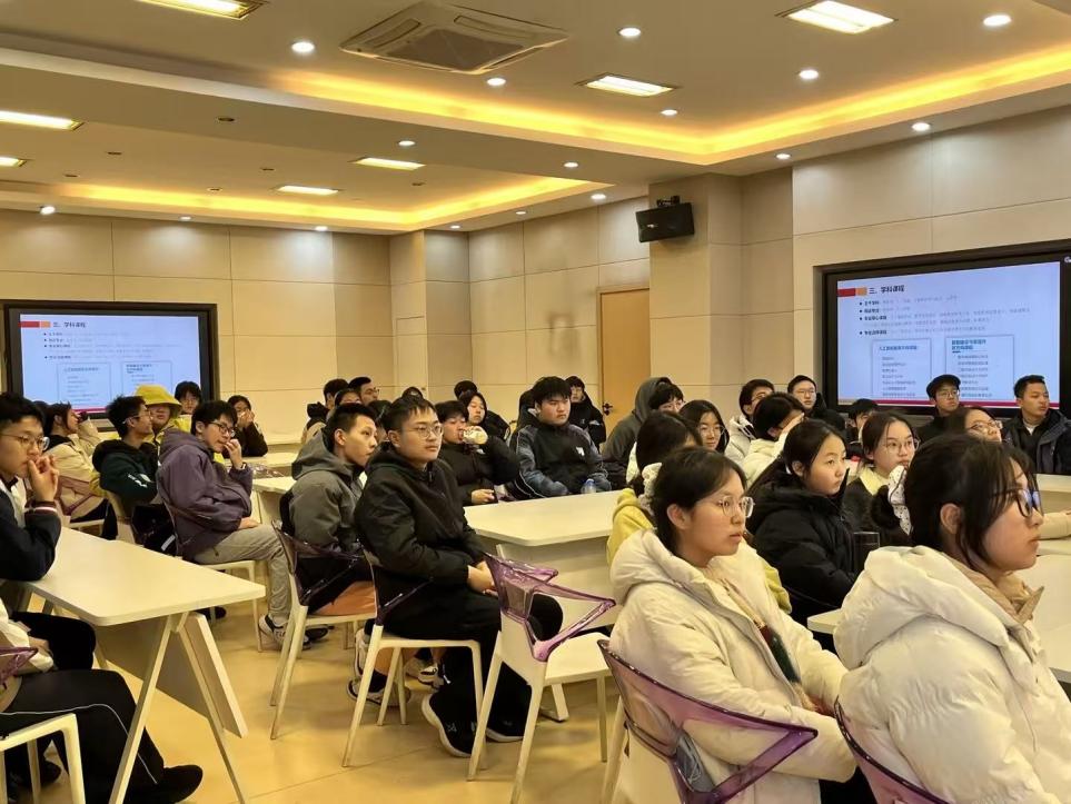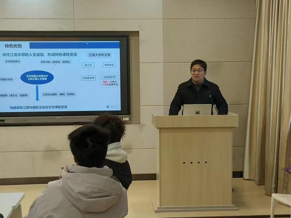 12月26日,无锡一中高二19班学生来院,参加主题为“字里行间,寻味江南——开启汉语言文学的沉浸之旅”的“探秘专业”活动,中文系负责接洽。中文系主任陈佳冀教授详细介绍了汉语言文学专业的鲜明特色,并重点展示了专业在课程体系、师资力量、学生去向方面的特色与亮点。专业优秀学生沈季楠从学生的视角,讲述了汉语言文学前沿学术活动对自身成长的帮助,认为江南大学汉语言文学专业在开放包容的学术氛围中为个人发展提供了无限可能。