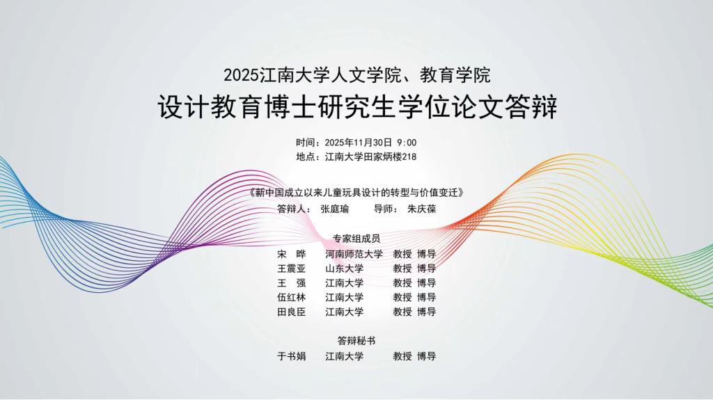 2025年11月30日,博士研究生张庭瑜的学位论文答辩在江南大学田家炳楼218室圆满举行,其论文题目为《新中国成立以来儿童玩具设计的转型与价值变迁》。该研究从设计学、教育学、历史学交叉视角切入,系统梳理新中国成立后儿童玩具在设计背景、类别特点、主题题材、造型色彩、材料工艺等方面的历史变迁,深入剖析背后产业、消费、文化、育人等多重价值逻辑的演变。由河南师范大学宋晔教授、山东大学王震亚教授,江南大学王强教授、伍红林教授、田良臣教授组成的答辩委员会,对该论文的选题和成果予以了充分肯定,一致认定该论文是一篇比较优秀的博士学位论文。同时,答辩委员们对学院设计教育博士点建设与人才培养也充满信心和期待。