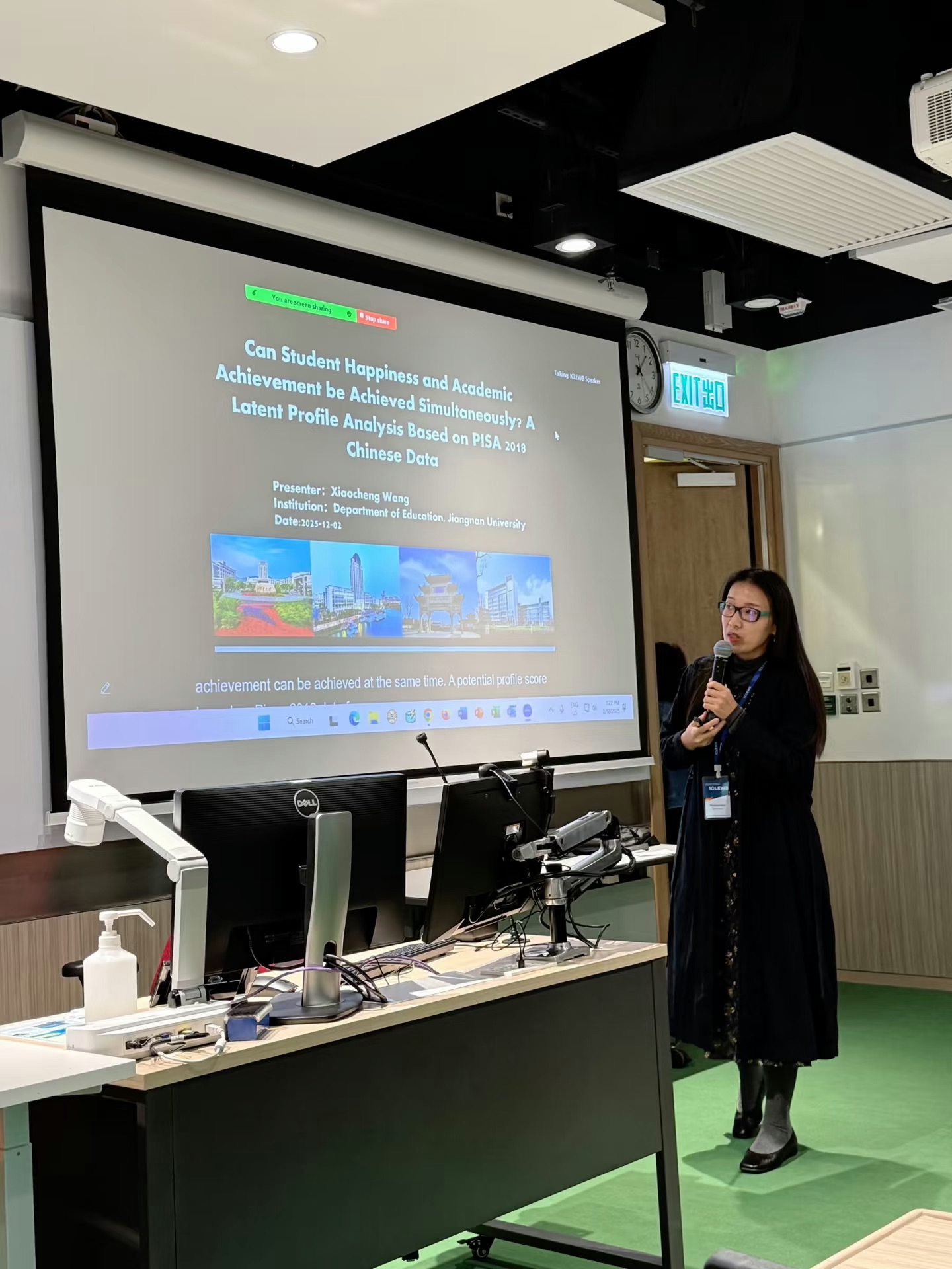 江南大学人文学院教育系王晓诚副教授应邀参加大会,共同探讨生命教育与幸福感领域的最新研究成果。香港当地时间12月2日下午1点,王晓诚参加了第N分会场的小组会议,会议主题为:“生命与价值观教育对积极生命价值观和幸福感的影响”(Impact of Life and Values Education on Positive Life Values and Well-Being)。王晓诚就该主题做口头报告:“学生幸福和学业成就是否可以兼得?基于PISA2018中国数据的潜在剖面分析”。该报告基于PISA2018中国四省市学生数据,使用“以个体为中心”的分析技术——潜在剖面分析,探讨了主观幸福感和学业成就在不同个体身上的组合情况,同时探讨了个体、家庭、学校层面的一系列因素对学生剖面类型的预测效果。潜在剖面分析识别出四类群体:“不满意的中等生”(生活满意度偏低/学业成绩中等)、“满意的中上游学生”(生活满意度较高/学业成绩中上水平)、“最不满意的中等生”(生活满意度最低/学业成绩中等)以及“满意的差生”(生活满意度最高/学业成绩最低)。这一发现揭示了传统的“以变量为中心”的研究难以捕捉的群体异质性现象,为学生幸福和学业成就的均衡提升提供了重要启示。研究还发现,学生个体层面(例如,竞争性动机、阅读态度、成长型思维、心理韧性)、家庭层面(例如,家庭社会经济地位、父母情感支持)、学校层面(例如,教师支持、教师适应性教学、教师的认知激活策略、教师教学热忱、课堂纪律氛围、学校归属感)相关变量对我国青少年剖面类型从属具有显著预测作用。