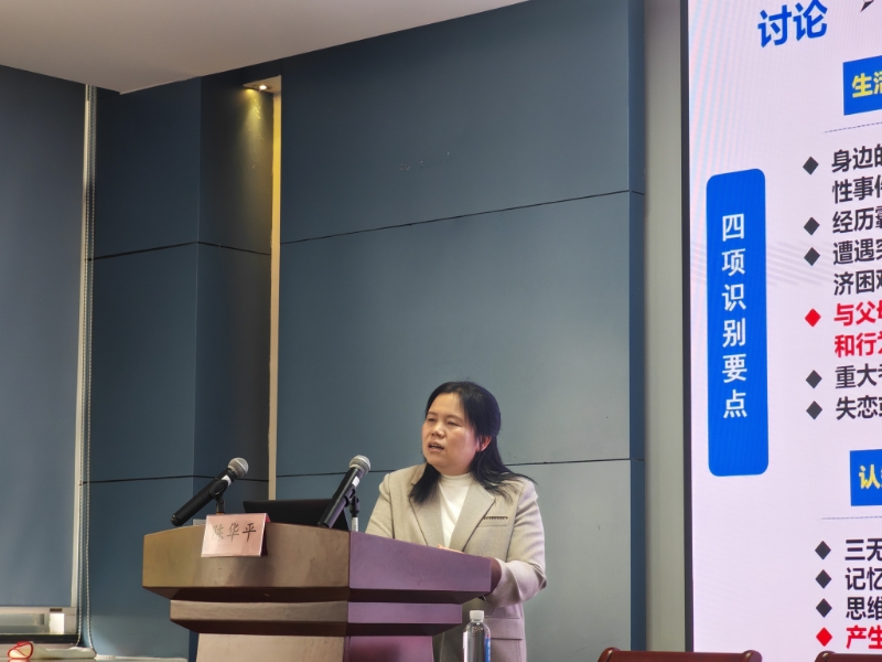 为进一步加强学生心理健康工作,提升研究生导师与班主任在学生心理危机识别与干预方面的专业能力,4月8日,人文学院举办了以“读懂内在失衡--大学生心理危机识别和早期干预”为主题的心理健康工作能力提升培训。培训邀请校心理健康教育中心副教授、中国心理学会临床与咨询心理学注册系统注册心理师陈华平主讲。培训由人文学院副书记徐璐主持,人文学院分管研究生教育副院长于书娟出席活动,研究生导师、班主任参加培训。